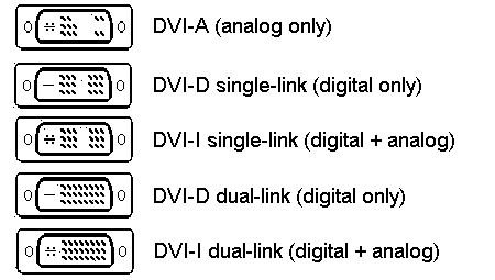 Il connettore DVI-A ha 15 pin, 3 righe con 5 pin ciascuna, in cui i primi 4 pin trasmettono i segnali R, G, B e l'ultimo trasmette il segnale di sincronizzazione.