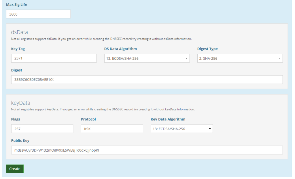 Dopo aver inserito e compilato tutti i campi, clicca Create per registrare il DNSSEC al provider. Controllare l'andamento su Cloudfare per verificare la conferma di utilizzo della DNSSEC.