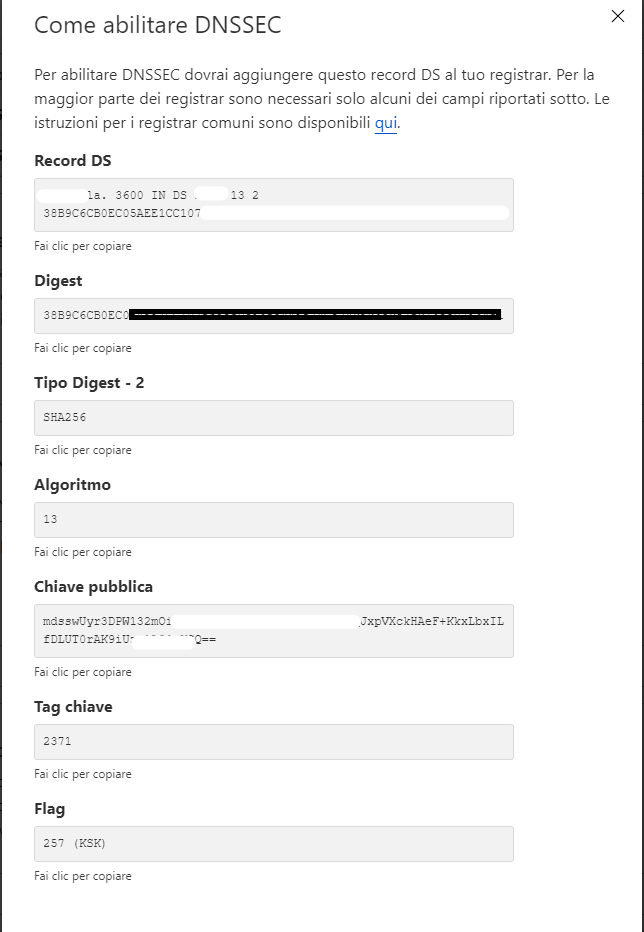 Nel cliccare attiva dnssec ti sarà catapultato tutte le credenziali che andremo a scrivere al nostro provider di dominio.
