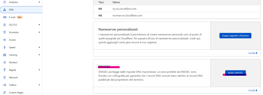 Accedi al tuo pannello cloudfare e naviga dal menu a sinistra su DNS per poi cliccare Attiva nella sezione dedicata DNSEEC.