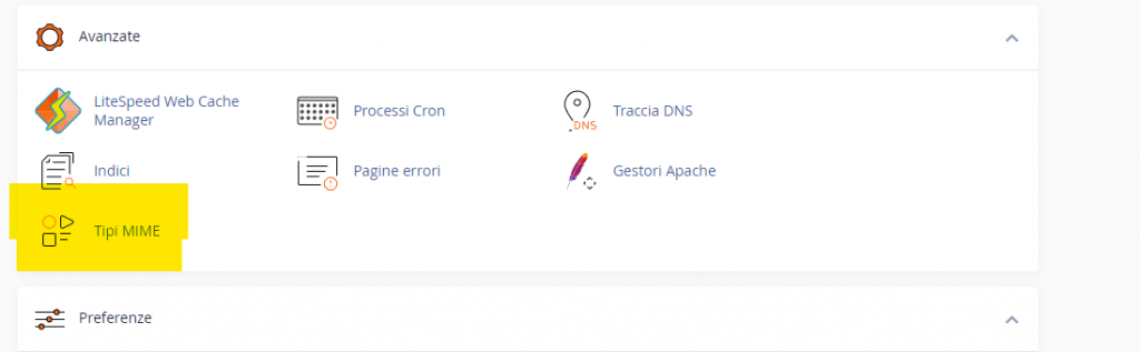 Per creare un tipo MIME puoi accedere al tuo account e utilizzare lo strumento Tipi MIME disponibile nel cPanel.