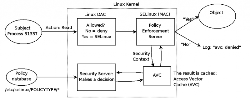 Quando un soggetto (ad esempio un'applicazione) tenta di accedere a un oggetto (ad esempio un file), il server delle applicazioni della politica nel kernel controlla innanzitutto la cache del vettore di accesso per le autorizzazioni dell'oggetto e dell'oggetto. Se la decisione non può essere presa esaminando la cache, il server determina se l'accesso verrà effettuato in base alle politiche di sicurezza. Vale anche la pena ricordare che SELinux non sovrascrive le regole di accesso impostate nel DAC.