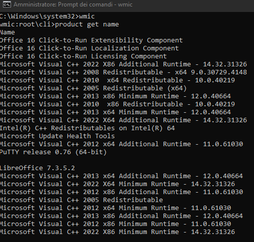 Dovresti vedere il prompt wmic:rootcli> dopo aver digitato il comando sopra. Ora lo strumento è pronto per eseguire i comandi. Per elencare tutti i programmi, digita in inglese product get name e premi invio.