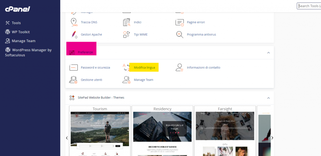Per iniziare il processo di installazione, devi prima accedere al tuo account cPanel. Una volta effettuato l'accesso, cambiamo la lingua del nostro pannello di controllo su "italiano" in modo da facilitare la fase per abilitare LiteSpeed web cache. Quindi vai alla sezione "Preference" in fondo alla pagina.
