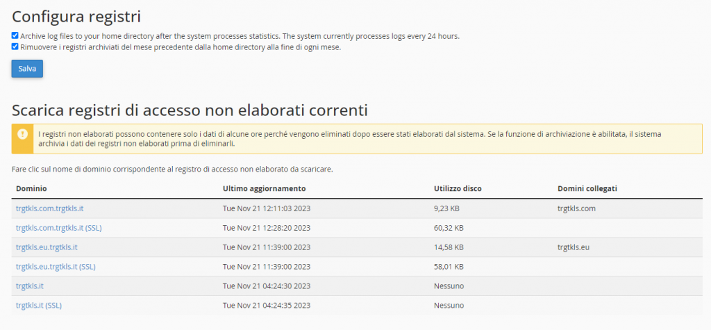 La sezione successiva è dove è possibile scaricare tutti i registri di accesso non elaborati. Dovresti vedere una vista tabella, che rappresenta tutti i tuoi domini/sottodomini. Per ognuno di questi, cPanel ti fornirà l'ultimo aggiornamento del registro di accesso non elaborato e anche l'utilizzo del disco del registro. Per scaricare un registro specifico, fare clic sul dominio/sottodominio concreto.