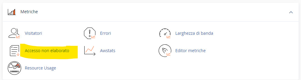 Ora accedi a Cpanel, una volta visualizzata la pagina predefinita di cPanel in cui vengono mostrate tutte le funzionalità che ha da offrire, dovrai individuare il "Accesso non elaborato". Puoi farlo utilizzando lo strumento di ricerca disponibile nella parte superiore della pagina o individuando la funzione "Metrica" gruppo di funzioni in cui "Accesso non elaborato" la funzione si trova.