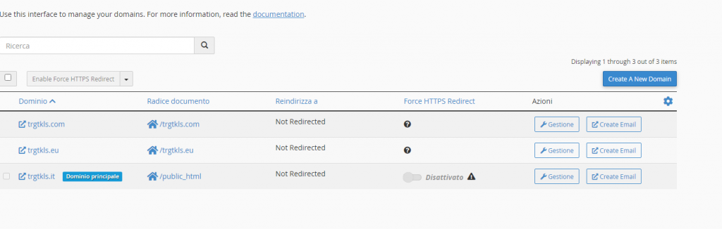 - Forza reindirizzamento HTTPS : in questa colonna potrai forzare un reindirizzamento al protocollo https:// per un nome di dominio.