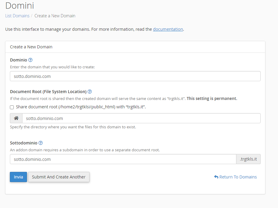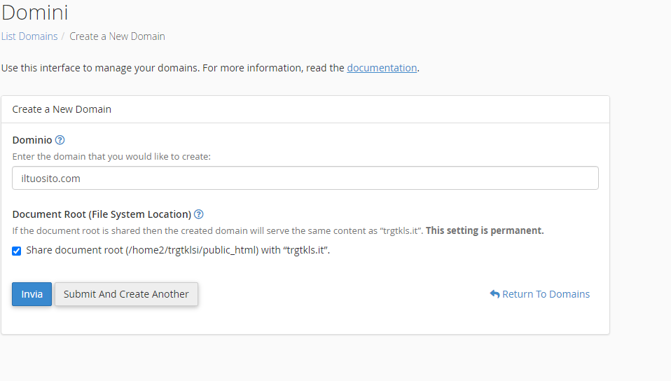 Aggiungere un nuovo nome di dominio in cPanel