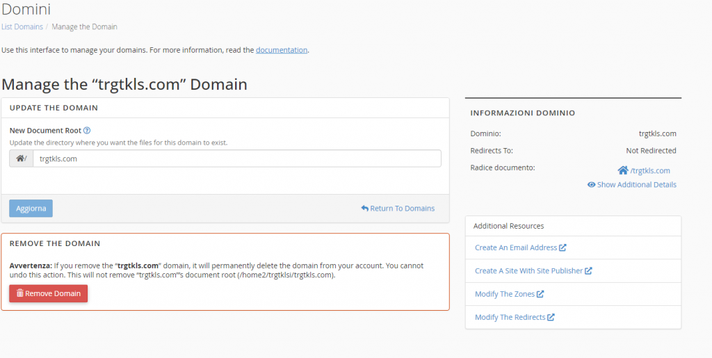 Gestisci i domini esistenti nel cPanel