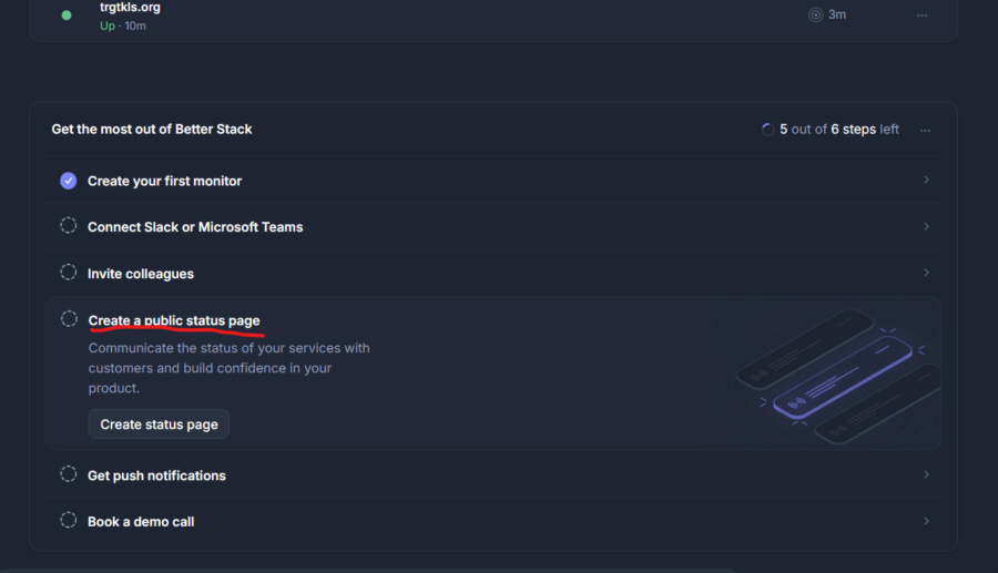Nella pagina principale dei monitor attivi seleziona "Create a publich status page" per iniziare la configurazione della pagina di stato personalizzato, scegli il nome ed il link definitivo di betterstack per agganciare i monitor. Scendendo giu nella stessa pagina troverai la sezione per caricare il logo e personalizzare il sottodominio Cname.