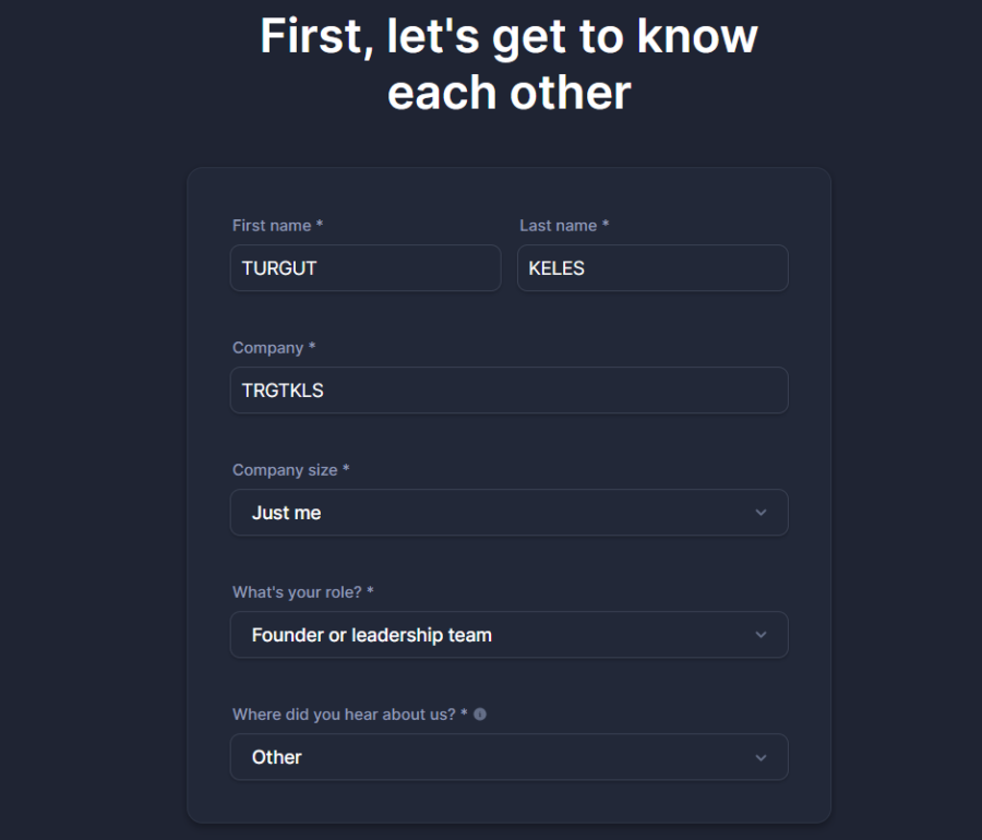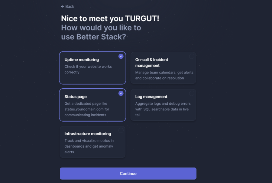 Per creare una pagina di stato con betterstack sarà necessario come prima registrarsi sul sito ufficiale, dopo aver completato la registrazione ti verrò richiesto alcune informazioni come ad esempio nome e cognome, dimensione aziendale ed il ruolo che si copre in questa azienda. Rispondi alle domande per proseguire e completare la registrazione su betterstack.