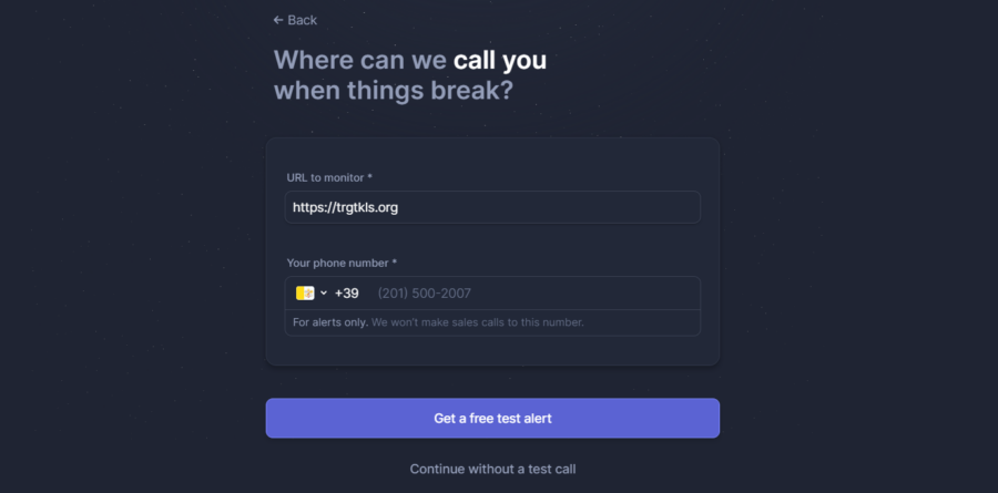 Qui ora possiamo digitare L'url del quale dobbiamo monitorare e il numero di telefono per ricevere avvisi di servizio, se non si dispone di un numero di telefono puoi semplicemente cliccare su continua senza test di chiamata.