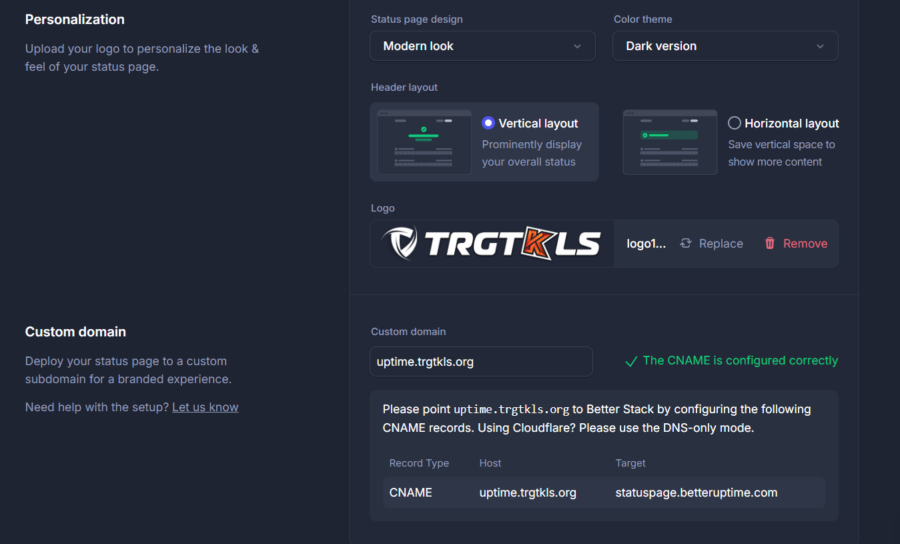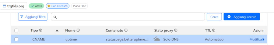 Io utilizzo cloudfare CDN, quindi la mia configurazione sarà cosi, sarà comunque la stessa anche sul tuo provider, applicato le modifiche salva e apri la tua nuova pagina es: uptime.trgtkls.it. Questa pagina d'ora in poi sarà la tua pagina di stato personalizzato, puoi aggiungere fino a 10 monitor con l'account gratuito. Questo e tutto.
