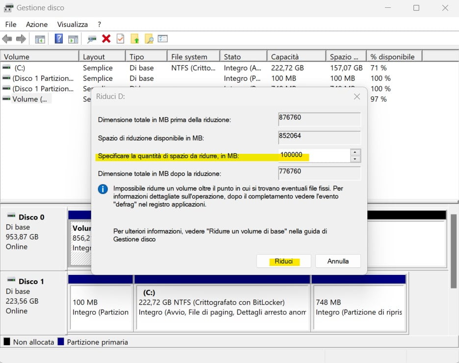 Una finestra pop-up apparirà ora sullo schermo, digita la dimensione in MB che vuoi liberare nella finestra. Io creerò una partizione di 100GB, equivalente a 100000MB.
