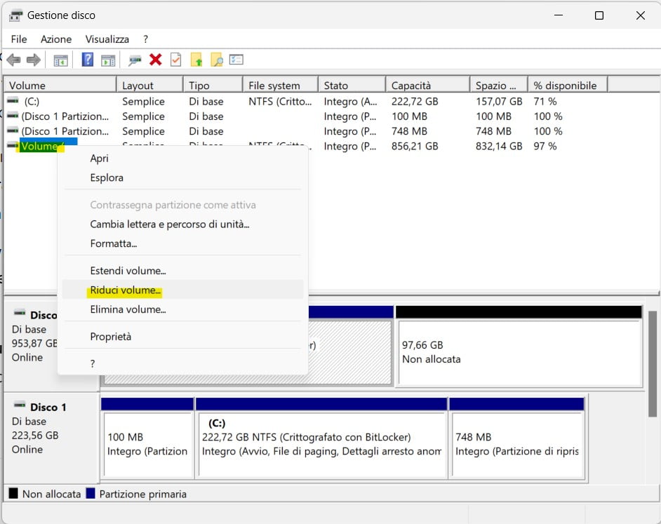 Dopo aver aperto lo strumento Gestione disco, vediamo l'elenco dei dischi sul nostro computer, fare clic con il tasto destro sul disco C che divideremo e fare clic sull'opzione Riduci volume dal menu a comparsa. Ora individua e fai clic con il pulsante destro del mouse sulla partizione che desideri ridurre