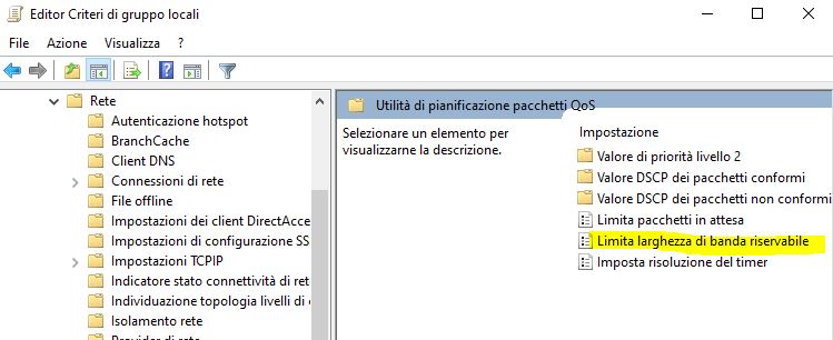 Configurazione computer -> Modelli amministrativi -> Rete -> Utilità di pianificazione pacchetti QoS