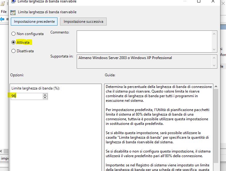Nota: anche se il limite è impostato, ciò non significa che l'utilizzo complessivo della larghezza di banda da parte delle applicazioni e dei programmi non possa superare l'80% della velocità Internet disponibile. Il 20 percento della larghezza di banda riservata viene reso disponibile solo quando esplicitamente richiesto da un'attività prioritaria. Tuttavia, se non è in esecuzione un'attività critica che richiede questa larghezza di banda riservata del 20%, può essere utilizzata per attività regolari.