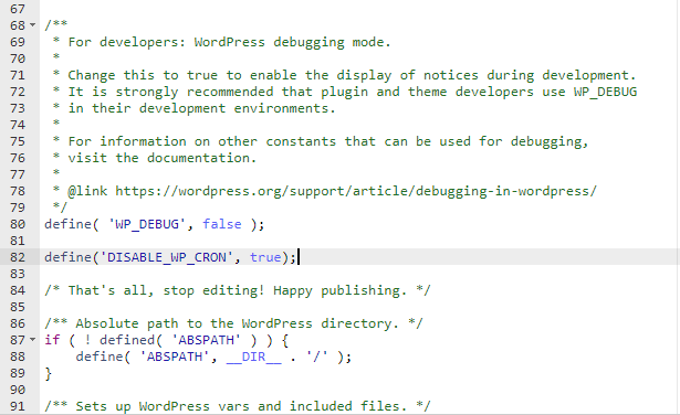 Per disabilitare WP-Cron, devi aggiungere quanto segue al tuo file wp-config.php, appena prima della riga che dice, “That's all, stop editing! Happy publishing.”: