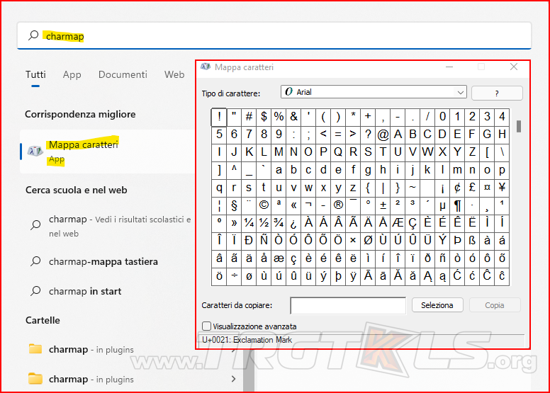 Un'altra soluzione sarebbe di utilizzare la nostra charmap di windows. Charmap ci permette di trovare le lettere speciali che avremo bisogno. Per eseguire charmap digita nella barra del meno di windows charmap e avvialo.