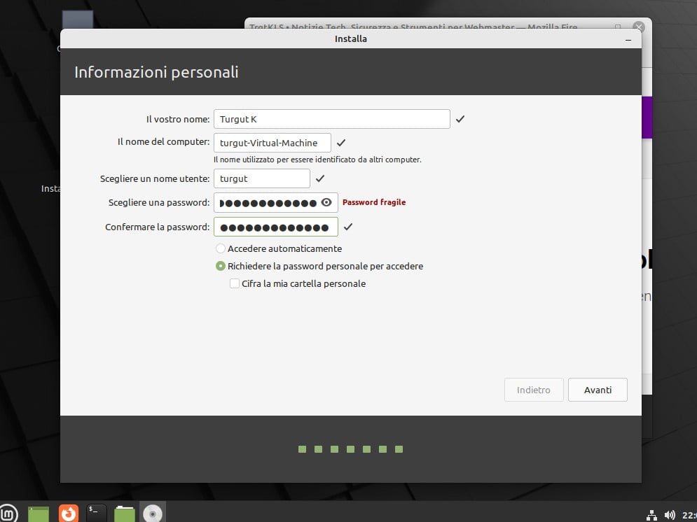 Digitare la password per accedere all'utente, e la password che sarà usato come root durante l'utilizzo del terminale.
