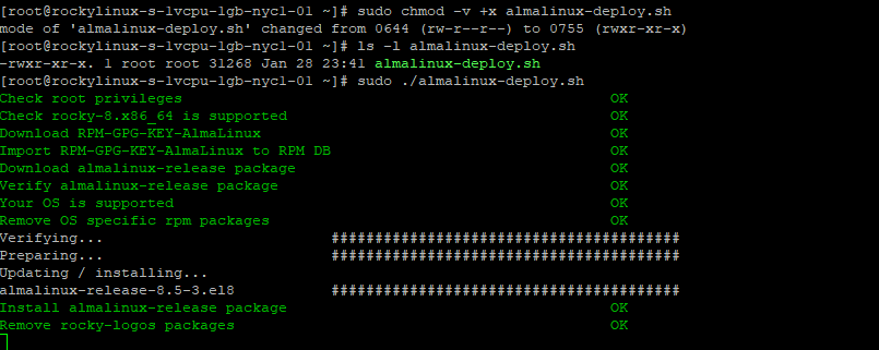 Per migrare da Rocky Linux 8 ad AlmaLinux 8, eseguire lo script almalinux-deploy.sh.