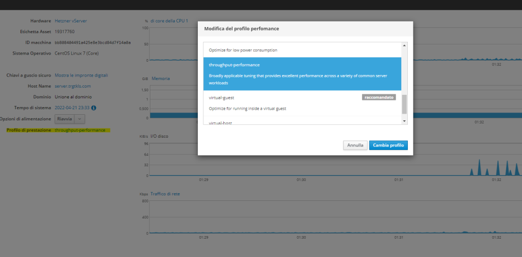 Se stai usando cockpit puoi facilmente e velocemente configurare Tuned in base alle tue esigenze nella sezione Sistema > Profilo di prestazione