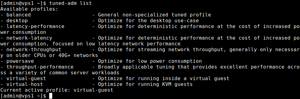 Su Centos 7 esistono profili di ottimizzazione predefiniti che riflettono particolari requisiti del carico di lavoro. Se stai usando un server Ubuntu questa lista potrebbe contenere più profili. I profili disponibili su Centos 7 sono: