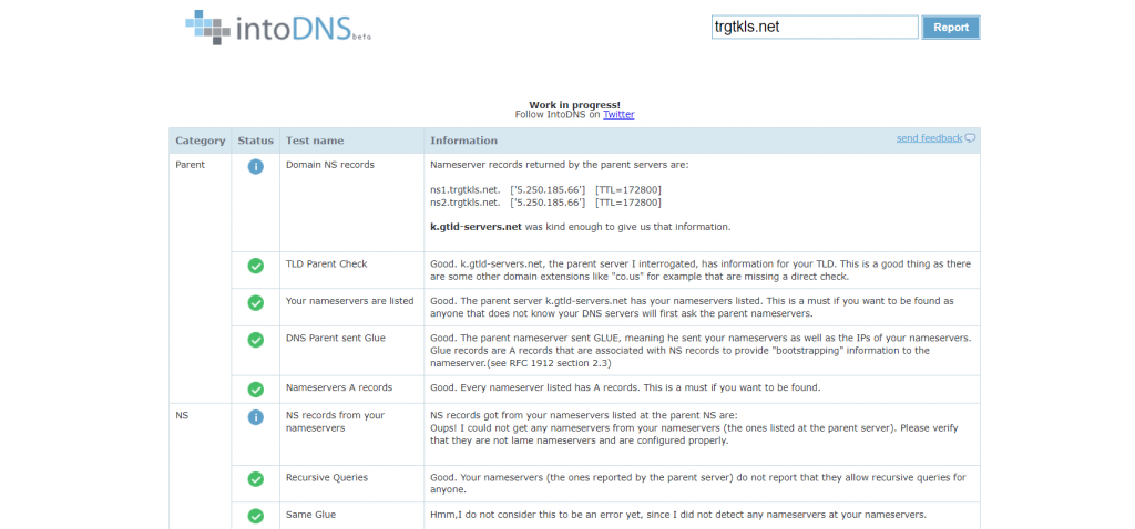 Una volta configurati i record DNS, è quindi importante verificare che le modifiche vengano propagate correttamente su tutta la rete globale, puoi utilizzare intoDNS per fare le eventuali verifiche.