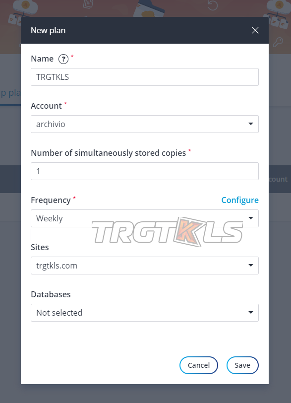 - Seleziona il sito web in qui sarà effettuato il piano backup