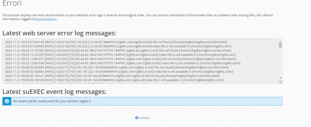 A seconda dei messaggi di errore che troverai nel "Errori" del servizio cPanel puoi determinare se il tuo sito web funziona correttamente o meno. Se non sei sicuro del significato di errori specifici, dovresti sempre contattare il team di supporto tecnico per ulteriore assistenza e indicazioni in merito.