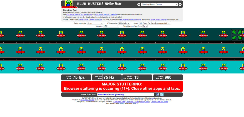 È possibile misurare la quantità di ghosting presente sul monitor tramite testufo.com. È possibile modificare la velocità di movimento degli UFO regolando il numero di pixel al secondo su questo strumento e ottenere risultati diversi con test diversi.