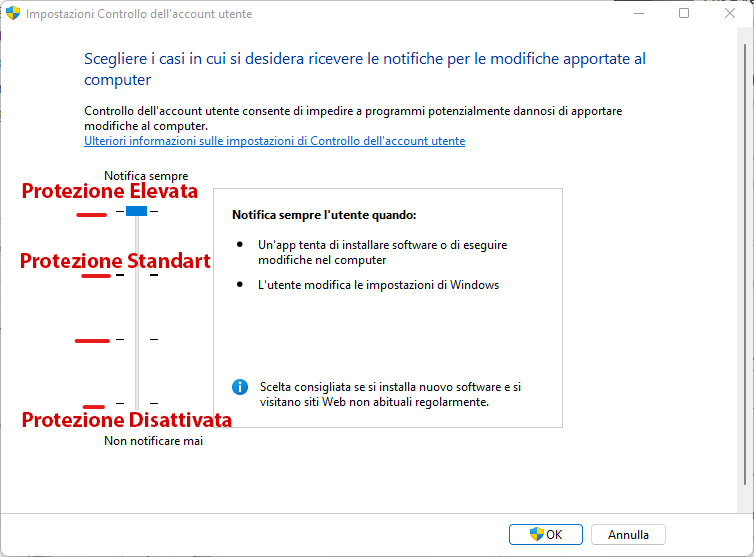 - Avvisami sempre: i programmi tentano di installare software o apportare modifiche al mio computer e quando apporto modifiche alle impostazioni di Windows.