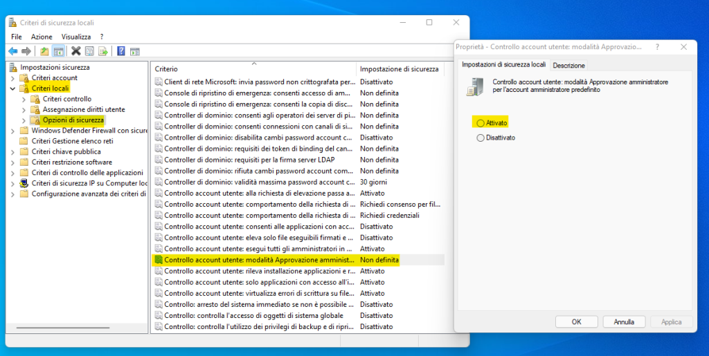 Puoi modificare tale impostazioni anche tramite Politiche sicurezza Locali, digita secpol.msc nella barra di ricerca e apri i criteri di sicurezza locali.