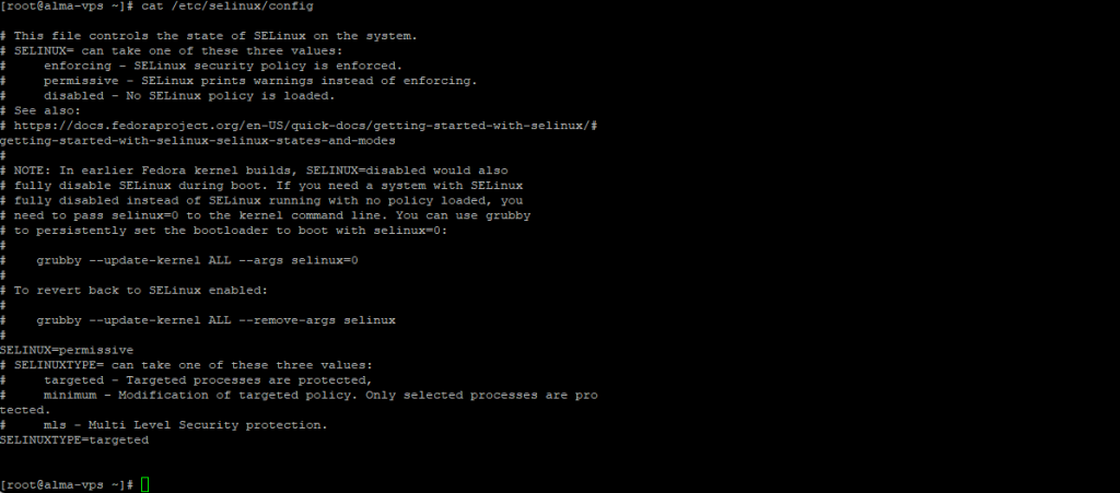 Il file è interpretato in modo molto chiaro: modificando i valori delle variabili SELINUX e SELINUXTYPE, possiamo impostare rispettivamente lo stato di SELinux e la modalità di SELinux. Diamo un'occhiata a queste mod.