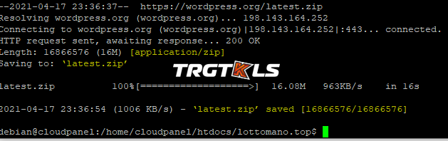 Innanzitutto, accedi al tuo server come root o come utente con privilegio sudo. In secondo luogo, scarica l'ultimo pacchetto di installazione di WordPress nella webroot del tuo dominio. La webroot del tuo dominio in CloudPanel dovrebbe essere in: