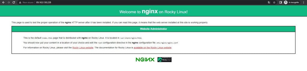 Verifica aprendo un browser e digita l' indirizzo IP del server nella barra degli indirizzi. Dovrebbe visualizzare la pagina di benvenuto di Rocky Linux 8 Nginx predefinita.