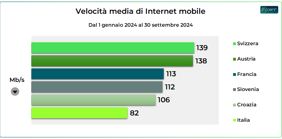 L'Italia è il Paese che offre la velocità media più bassa tra i Paesi vicini (82 Mb/s). Il paese più veloce è la Svizzera (139 Mb/s), molto vicino al risultato dell'Austria (138 Mb/s). Al terzo posto la Francia (113 Mb/s), al quarto posto la Slovenia (112 Mb/s) seguita dalla Croazia (106 Mb/s).
