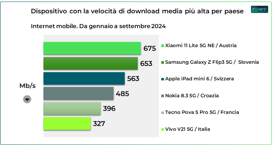 Nella velocità di Internet mobile, il dispositivo più veloce in Italia è il Vivo V21 5G. La velocità media con quello smartphone è di 327 Mb/s tra gennaio e settembre 2024.
