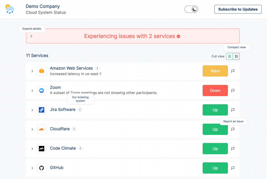 Il principale concorrente di Cachet è StatusGator. È un aggregatore di pagine di stato che racchiude tutti i vantaggi tecnici e molto altro ancora. StatusGator fornisce al tuo team una pagina di stato unificata per tutti i tuoi servizi, applicazioni, fornitori di cloud, ecc.