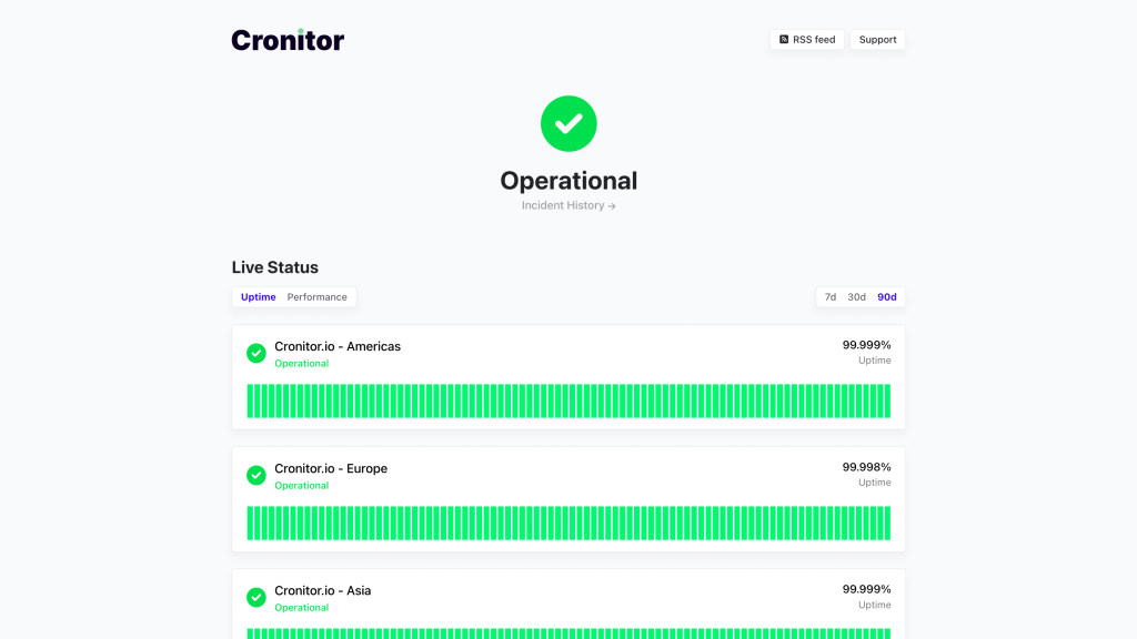 Le pagine di stato di Cronitor sono semplici, veloci e sono dotate di monitoraggio attivo integrato. Ciò significa che puoi impostare il monitoraggio del tempo di attività per i tuoi siti Web e le tue API e anche creare la tua pagina di stato utilizzando un unico servizio.