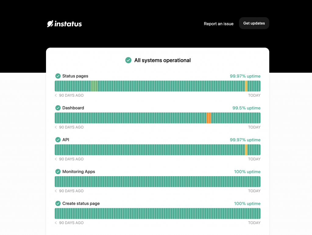 Instatus rende estremamente semplice e veloce la creazione di pagine di stato. Puoi creare una bellissima pagina di stato in soli 10 secondi ed è anche economica! Ecco perché Instatus è la scelta migliore per chiunque cerchi una pagina di stato self-hosted rapida e conveniente.