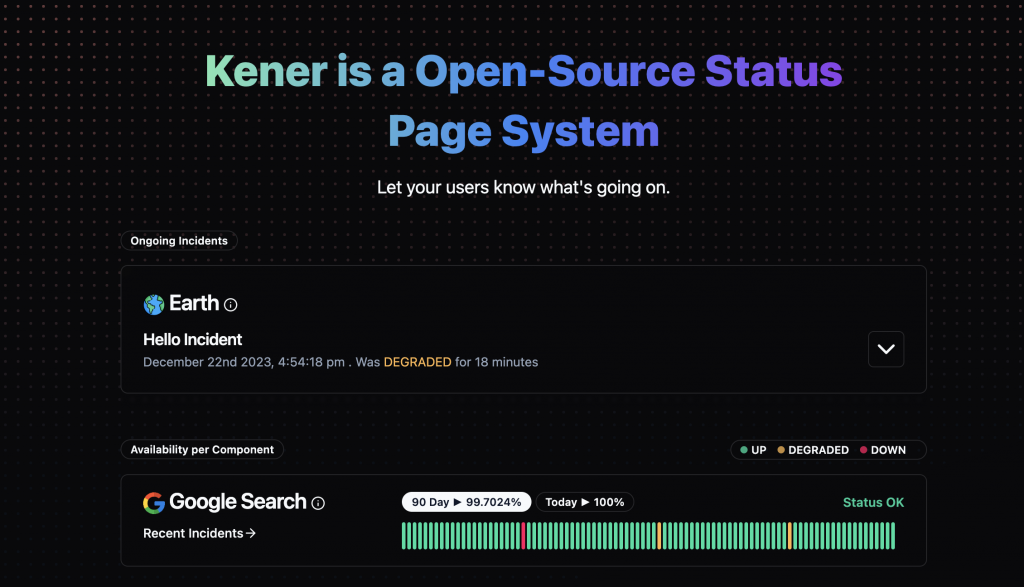 Kener è completamente open source, realizzato con Node.js, Svelte e Tailwind, il che lo rende estremamente facile da estendere e personalizzare.