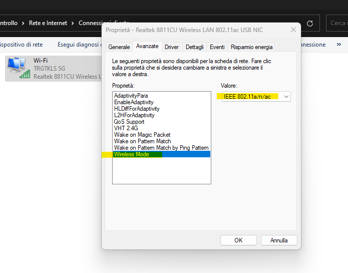 Nella scheda "avanzate" seleziona la modalità Wifi e porta ad IEEE 802.11a/n/ac, se non vuoi utilizzare affatto la 2.4 puoi disabilitarlo nella sezione "VHT 2.4G". Fatto ciò puoi cliccare OK per salvare le modifiche. Ora il tuo adattore e configurato per ricevere segnale 5G.