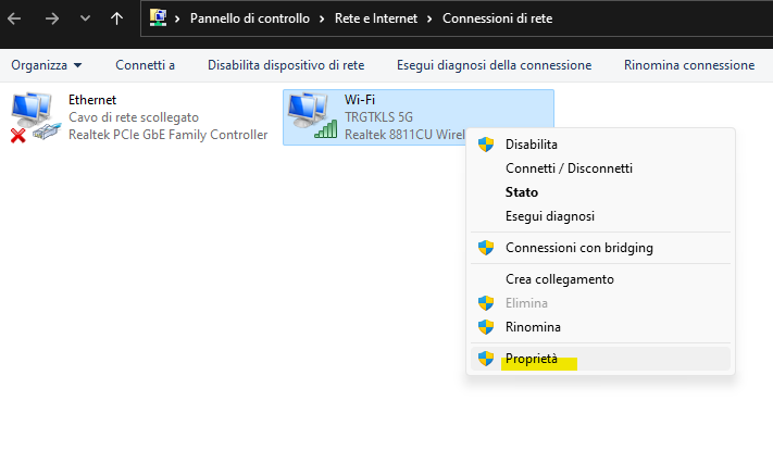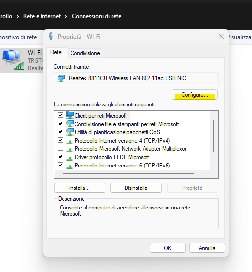 Pero se nonostante tu abbia un adattore che supporta 5g e non riesci a rilevare la rete 5g del tuo modem segui i seguenti passaggi. Vai alle impostazioni di configurazioni rete nella scheda rete che utilizzi.