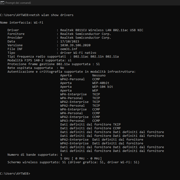 Se l'autput dice che l'adattatore di rete supporta le modalità di rete 802.11ge 802.11n, significa che il computer è in grado di supportare solo reti a 2,4 GHz.