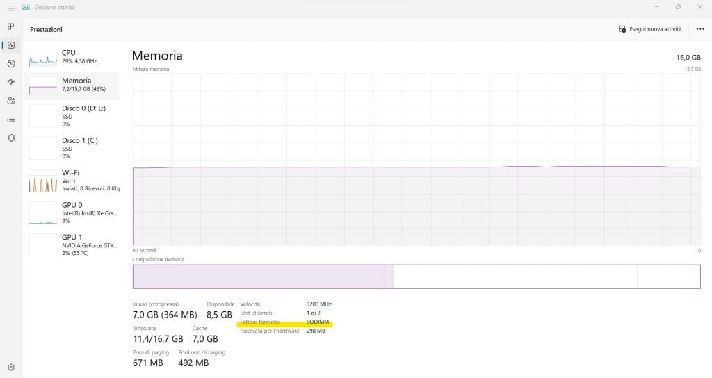 Detto questo, puoi verificare oltre alle dimensioni e ai tagli distintivi su un modulo, puoi anche determinare quale modulo RAM con fattore di forma è installato sul tuo PC Windows senza dover smontare la Ram. Puoi semplicemente utilizzare Task Manager (gestione attività) vedi foto sotto.