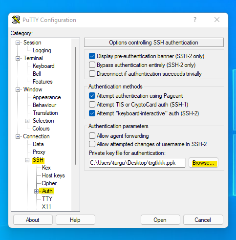 Nella sessione SSH -> Auth clicca su Browse per caricare la chiave SSH generata. Caricato la chiave torna al terminare Session in alto. Digita l'indirizzo IP per connetterti. Avendo già copiato e incollato la chiave SSH come prima menzionato nella tua dashboard login SSH, la connessione avverrà senza la richiesta di alcuna password. Perchè si è già autenticati tra Pc e il server tramite SSH Key.