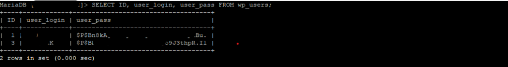 Tabella di query wp_users per recuperare tutti gli utenti ID, il nome di accesso e la password e identificare il campo ID nome utente dell'account che richiede la modifica della password. Il valore ID nome utente verrà utilizzato per aggiornare ulteriormente la password.