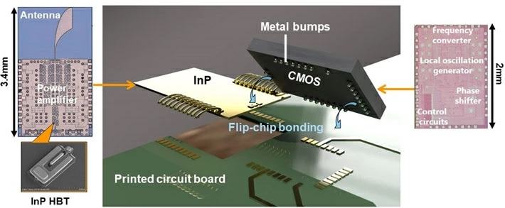 Per risolvere questo problema, NTT e Tokyo Tech hanno affrontato con successo il problema attraverso l'incollaggio flip-chip di CMOS-IC e InP-IC, collegandoli utilizzando protuberanze metalliche con dimensioni nell'ordine di diverse decine di micrometri.