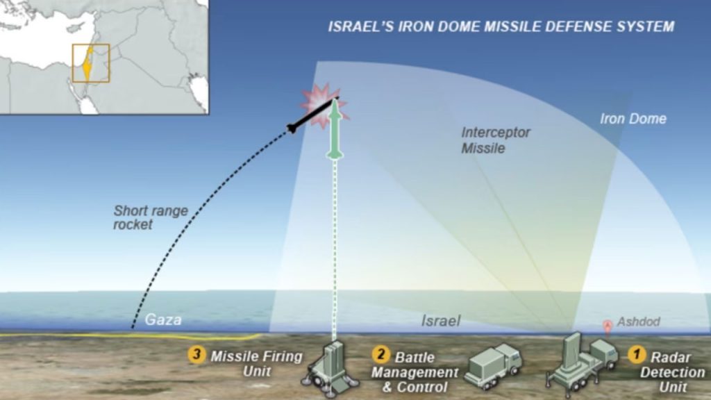 Parlando dell'israele il meccanismo è progettato per fermare e distruggere i razzi a corto raggio e i proiettili di artiglieria che vengono sparati da una distanza compresa tra 4 e 70 chilometri e la cui traiettoria verrà spostata dal centro abitato di Israele. Nel 2011, Israele ha lanciato Iron Dome per ridurre al minimo i danni e la perdita di vite umane causata dai razzi lanciati dai gruppi di resistenza ha completato questo sistema e lo ha messo in servizio.